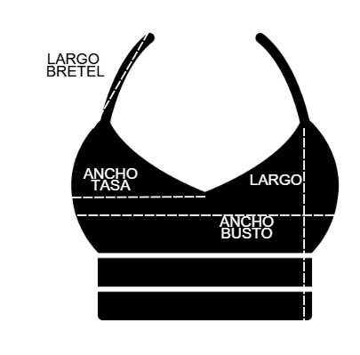 Ancho busto sin estirar el elástico: 32 cm Ancho busto elástico estirado: 40 cm Ancho tasa: 18 cm Largo: 28 cm Largo bretel(regulable): 20 cm