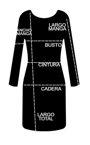 Busto(regulable): 35 cm Cintura: 36 cm Cadera(sin apertura): 46 cm Ancho mangas: 12 cm Largo total: 124 cm Largo mangas: 57 cm